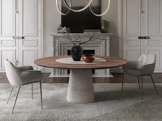 Kitchen with refined lines with island in marble finish and open wooden elements
